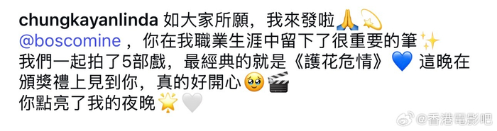 我們一起拍了5部戏,最经典的就是《护花危情》💙 这晚在颁奖礼上见到你,真的好开心🥹🎬