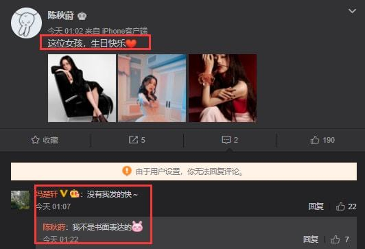 评论区有杂志主编好友冯楚轩留言,“没有我发得快”,陈秋莳在线秀恩爱“我不是书面表达的”,这是暗戳戳撒糖啊,不是书面表达是口头祝福,生日时陪在女友身边,用心满满。