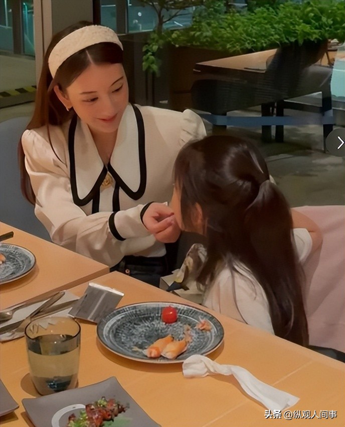 方媛衣着简单、妆容清淡,低头细心给女儿夹菜,亲自给孩子喂食,动作轻柔,眼神满是宠溺,母性十足。