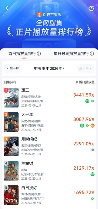 《逐玉》进入收官阶段,日播放量从6016万(4月4日)降至3583万(4月8日),剧情后期被批“战场儿戏化”,观众流向新剧。4月8日,《月鳞绮纪》以12.5%云合市占率终结《逐玉》连续霸榜,登顶长剧热播榜。