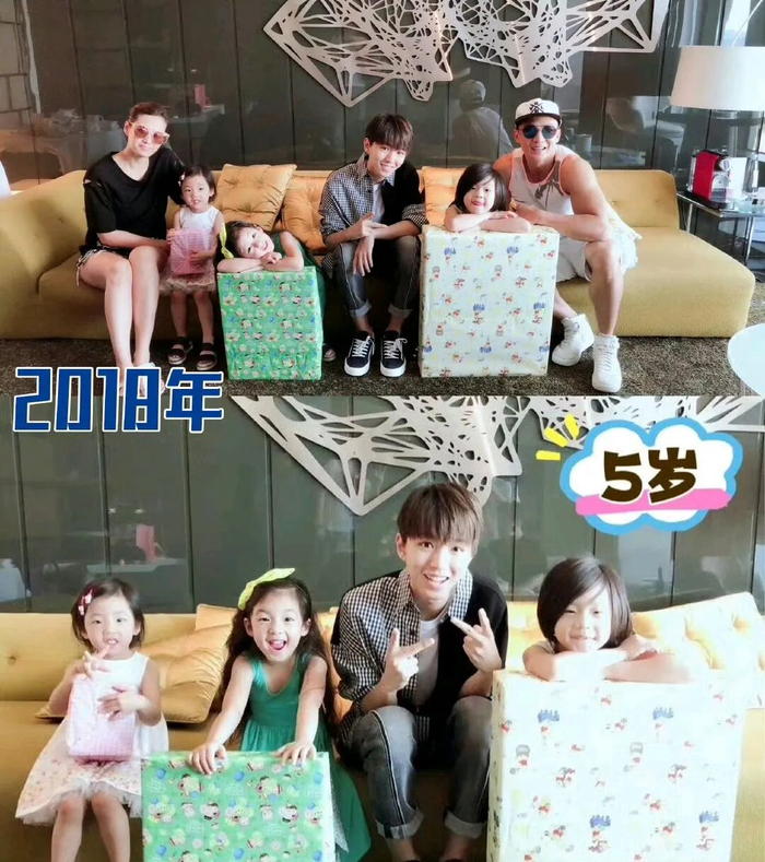 时间回到2018年7月,那是小泡芙的五岁生日。当时才19岁的王俊凯,特意以神秘嘉宾的身份,去到刘畊宏家里,为小泡芙庆祝生日。在这张珍贵的合照里,王俊凯坐在沙发中间,刘畊宏的三个孩子都紧紧依偎在他身边,每个人手里都抱着精心准备的礼物。为了迁就孩子们的身高,王俊凯特意弯下腰,对着镜头比出经典的胜利手势,眼神里满是温柔,对小泡芙更是格外宠溺。