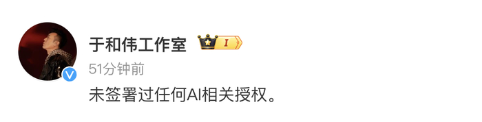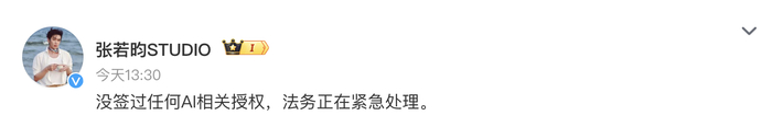 4月20日,张若昀工作室@张若昀STUDIO发文:“没签过任何AI相关授权,法务正在紧急处理。” 于和伟工作室也发文表示,未签署过任何AI相关授权。