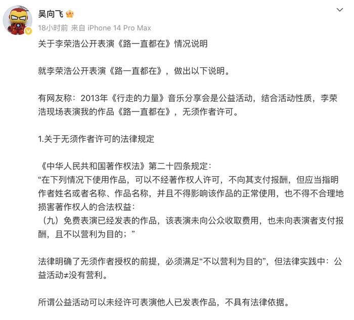 在关于李荣浩公开表演《路一直都在》情况说明一文中,吴向飞全面回应了此前种种争议焦点,认为2013年“行走的力量”音乐分享会并非纯公益、音著协出具的表演许可权属存疑,同时披露了与环球音乐的版权诉讼判决细节。