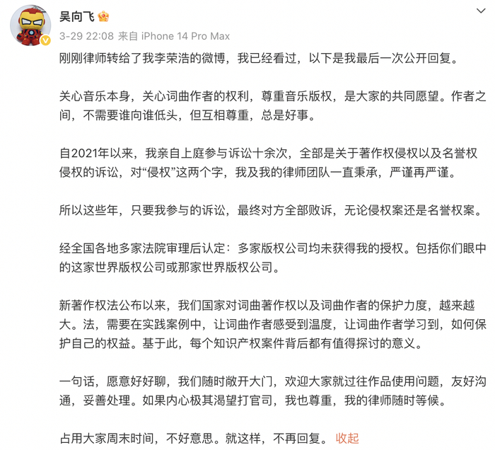 此前声称不再就李荣浩相关表演公开回复的词作者吴向飞,于4月15日晚间又发布了一篇千字长文。