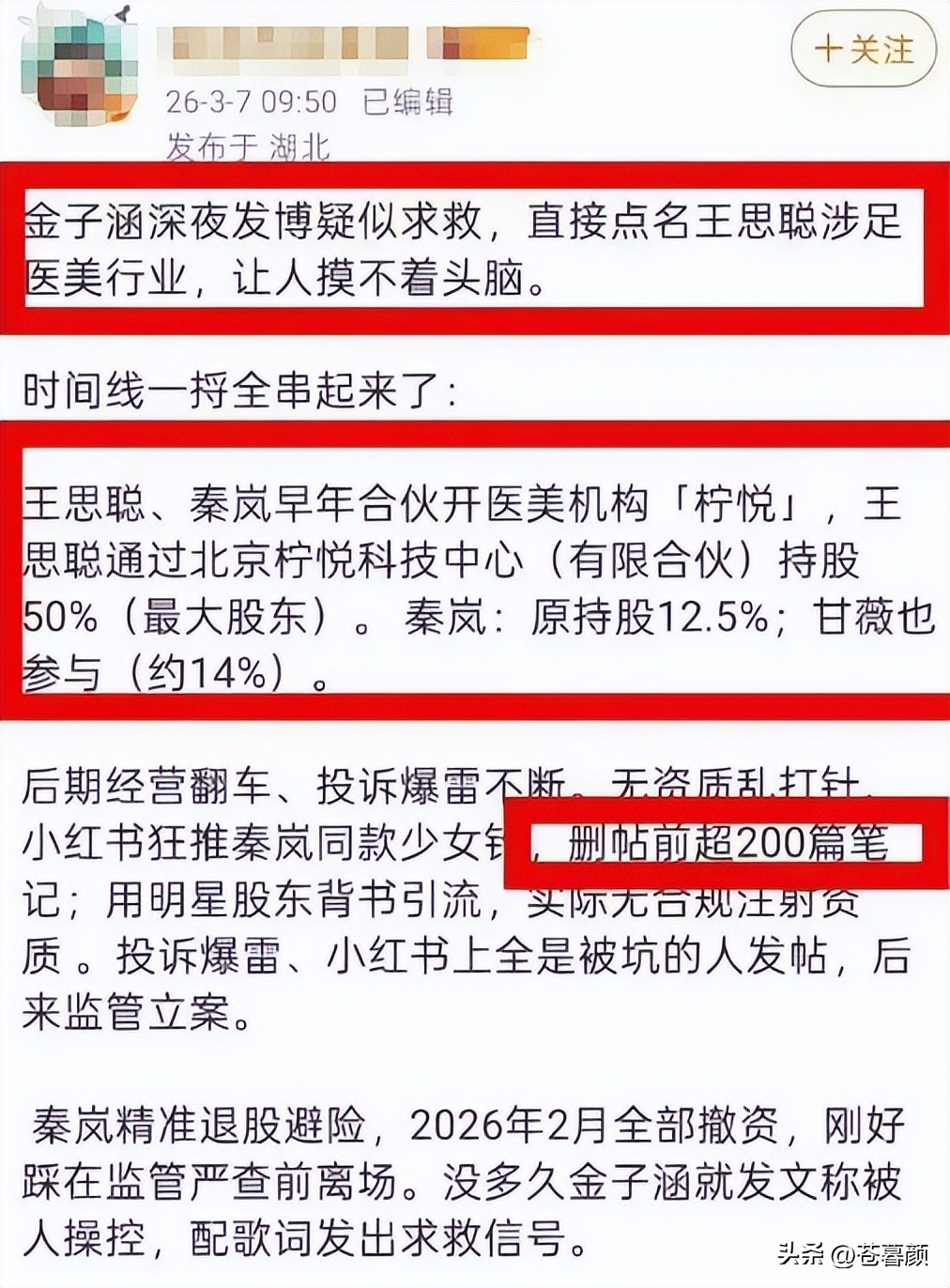 消息传开后,很多人把矛头指向了王思聪和秦岚的医美诊所,但双方都很快否认了,金子涵也发文说和他们没关系。