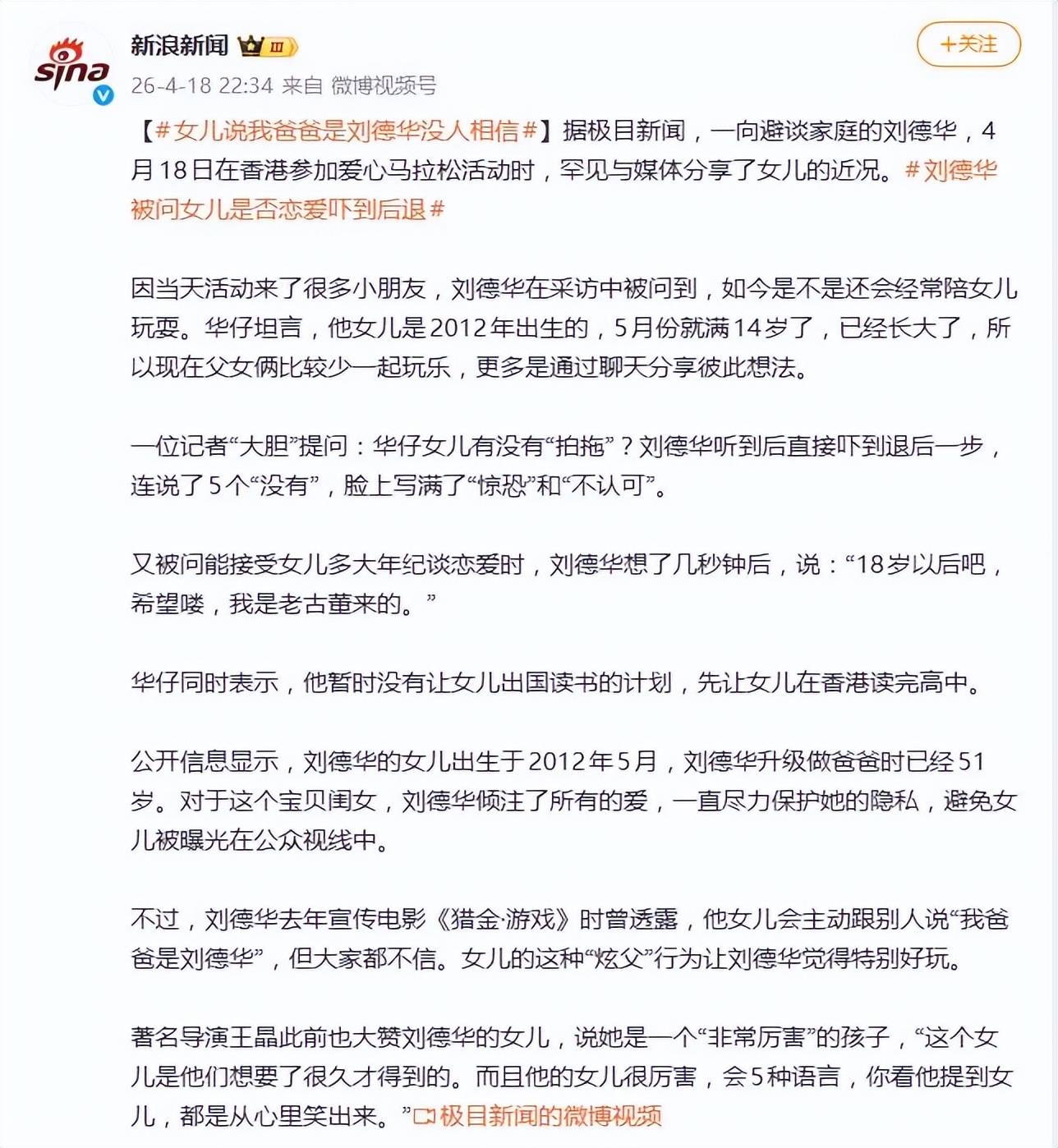 4月18日,刘德华在香港参加一场爱心马拉松活动。因为现场来了很多小朋友,采访的记者自然就把话题引向了他的女儿。华仔一改往日避谈的态度,坦然分享道,女儿是2012年出生的,今年5月就满14岁了,已经是个大姑娘。他坦言,现在父女俩比较少像以前那样一起玩耍,更多的是通过聊天来分享彼此的想法。