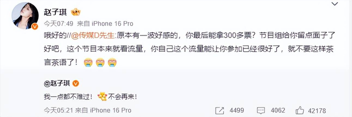 4月11日凌晨,赵子琪发文称“我一点都不难过!不会再来!”,回应《乘风2026》首轮公演淘汰结果。随后有网友留言批评她“流量不足却抱怨淘汰”“节目组给面子才拿304票”,并指责其发言“茶言茶语”。赵子琪直接转发该评论回复“哦好的”。