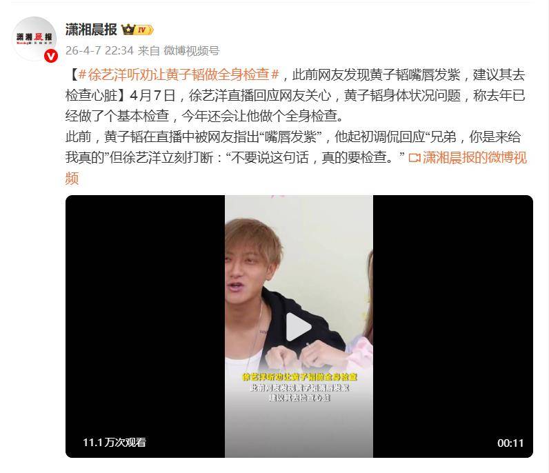 据4月7日晚间报道,一场直播里的几句对话,让黄子韬的健康话题直接冲上热搜。起因是网友在直播中,一眼盯住了黄子韬“嘴唇发紫”的细节,评论区瞬间被“建议检查心脏”的关心刷屏。
