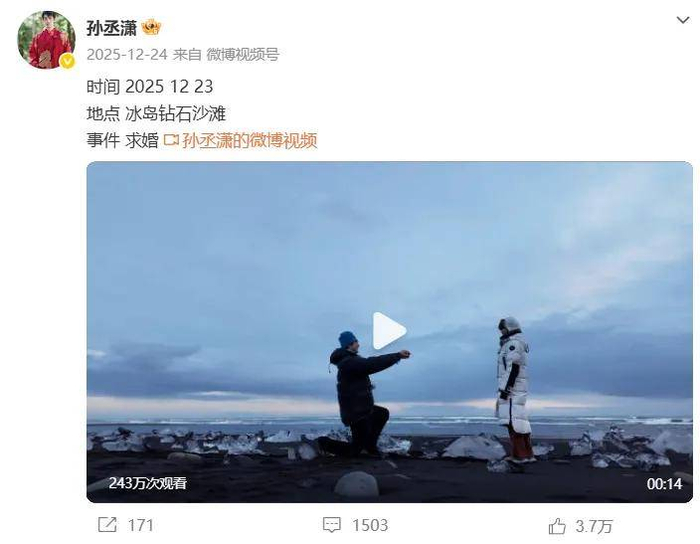 2025年12月23日,孙丞潇在冰岛钻石沙滩,以极光为幕、海浪为证,用 520 朵喷有金莎专属香水的白玫瑰求婚成功。这场求婚仪式感满满,求婚视频虽拍了四遍,但真实的感动远比精心设计的画面动人。