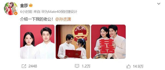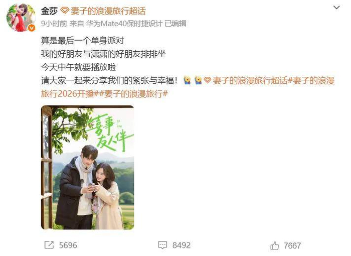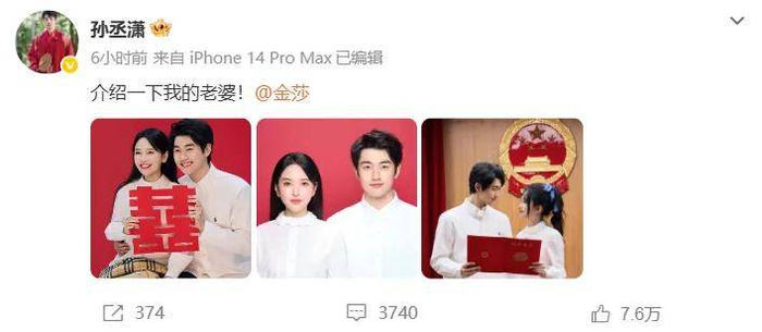 2026年4月9日,恰逢《妻子的浪漫旅行 2026》首播,金莎与孙丞潇同步晒出结婚证,以 “介绍一下我的老公 / 老婆” 的甜蜜配文正式官宣结婚。