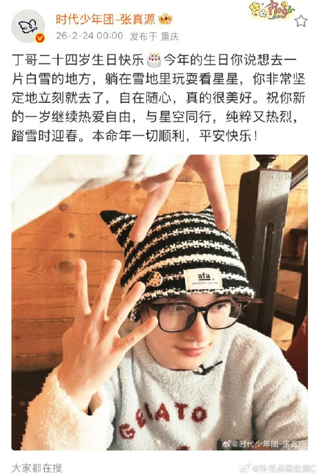 2026年4月16日张真源23岁生日当天,队友丁程鑫通过微博卡点16:16送上真挚祝福,以“独一无二的真源儿”称呼对方,并暖心祝愿他“平安开心、拥有好睡眠、享受生活中奇妙的时刻”,引发粉丝对两人深厚友情的共鸣。