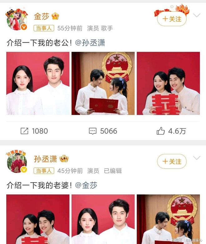 2026年4月9日中午,45岁歌手金莎和26岁演员孙丞潇在北京海淀区民政局办完结婚登记手续后,同步在个人微博晒出红底结婚登记照官宣婚讯,俩人互相@了对方的账号,一句“介绍一下我的老公”,一句“介绍一下我的老婆”,简单直白的两句话刚发出去,就引爆了全网热议,相关话题短短一小时就冲上热搜榜首,阅读量直接破亿。