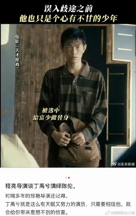 2020年,悬疑电影《天才游戏》拍摄现场。导演程亮在监视器前注视着一场关键闪回戏:丁禹兮饰演的贫寒少年李小江初次踏入豪门豪宅,暴雨将他淋得浑身湿透,脸上刻意涂抹的黝黑妆容掩盖了明星底色,而最撼动导演的是那双眼睛——"满是胆怯与闪躲,像一头受惊的小鹿,不知所措"。正是这个镜头,让程亮在多年后的专访中仍清晰回忆起当时的生理反应:"自己也一震,那一刻,他完全相信了自己就是这个人物,我也完全相信了他。"