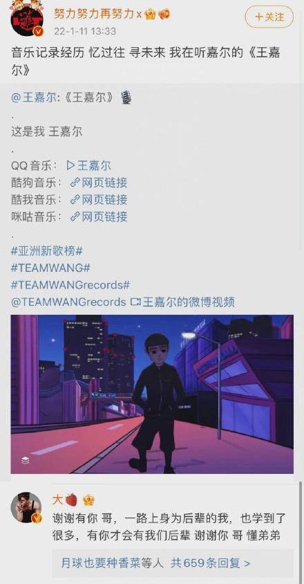 还有很多明星为王嘉尔新歌打call,我就不一一说了,比如谭维维、袁娅维、宋威龙、INTO1的刘彰、万妮达、飞儿乐团、硬糖少女303的希林娜依·高、李铢衔、徐明浩、SKY的郑人予等。