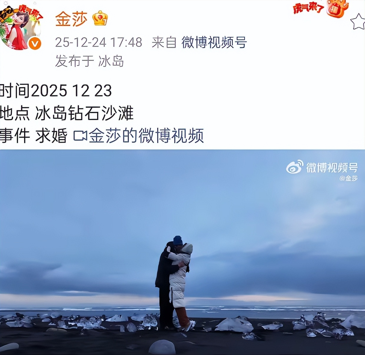 两人的感情也不是一时兴起。据了解,他们早在三四年前就悄悄开启了备婚计划,不仅定制了专属戒指,还早已正式见过双方父母,得到了家人的认可。2025年12月,孙丞潇在冰岛钻石沙滩极光下向金莎求婚,虽然求婚视频拍了四遍,但每一遍都充满了诚意。