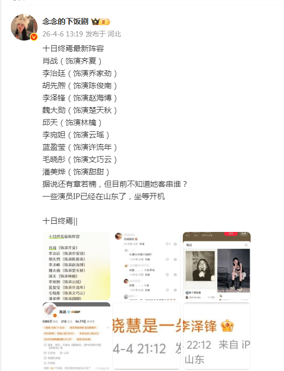 1. **吃瓜小萌**:肖战的高智商齐夏,配上青岛的美景,感觉这剧一定会爆炸!配角阵容也太强了吧,李治廷和胡先煦加起来直接带人狂喜!,2. **剧僧**:这次的网传阵容真的是一波超车,肖战齐夏+李治廷乔家劲,配上胡先煦的陈俊南,配角绝对能撑起一整季!,3. **剧迷直男**:看到邱天饰演林檎,我直接就怀疑多了,感觉这剧女主角线一定会有戏!文巧云和甜甜的角色也太有看点了吧!,4. **追剧小白**:许宏宇执导,蒋峰编剧,投资超2亿,特效团队是MORE VFX,这剧的制作水准和戏份都太多了,真是期待啊!,5. **吃瓜大师**:肖战飞青岛围读,配角阵容齐全,剧组还用了800㎡虚拟影棚还原终焉之地,这一季的观赏度直接拉满!,6. **剧评小站**:看到杨迪和徐志胜加盟,感觉这剧的反派和配角都有实力,特别是魏大勋饰演的楚天秋,绝对有看点!,7. **吃瓜八卦**:毛晓彤饰演文巧云,张雅钦和潘美烨饰演甜甜,这几位女主角的集结,直接让人期待剧里每一集的打斗和甜甜的反派转变!,8. **剧迷无厘头**:开机仪式在东方影都,100天的拍摄周期,肖战和李治廷的互动一定会爆炸,期待看到他们的化学反应!,9. **吃瓜达人**:从剧组到观众,真的太期待了!这波三季连拍的策略绝对会让这部剧更上一层楼,打卡青岛的美景,拍出来的画面一定会让人流连忘返!,10. **剧迷老友**:这次的阵容和制作团队都太强了,感觉这部剧一定会成为年度必看剧,肖战和李治廷的组合,直接锁定全网观众!1. **网友A**:肖战的高智商男主角,配上齐夏这个名字,感觉他一定会帅炸全场!配角这波也太强了,邱天、毛晓彤加盟,直接干起来啊! ,2. **网友B**:《十日终焉》这剧氛围感太强了,800㎡虚拟影棚还原终焉之地,特效团队是MORE VFX,完全靠这级别就毁了! ,3. **网友C**:许宏宇执导、蒋峰编剧,总投资超2亿,感觉这剧一定会爆炸,男一定是肖战,女主是谁来挑战啊! ,4. **网友D**:配角阵容太强了!李治廷、胡先煦、魏大勋加盟,反派楚天秋一角,魏大勋演得能不能看?我期待冲鸭! ,5. **网友E**:流浪地球特效团队操刀,虚拟影棚800㎡,这特效水准,直接让人怀疑人生!期待剧里特效场面炸裂! ,6. **网友F**:肖战飞抵青岛围读,书粉们一定会疯狂!齐夏这个角色,高智商谋略家,肖战演得定会宠辱不惊,期待剧情走向! ,7. **网友G**:邱天饰演林檎,毛晓彤饰演文巧云,感觉这剧女性配角都太强了,直接干起来,打卡女主角! ,8. **网友H**:三季连拍模式,总投资2-3亿,这剧制作力太强了,剧迷心中的稻草人,直接被碾成齑粉! ,9. **网友I**:李治廷饰演乔家劲,胡先煦饰演陈俊南,感觉这两个角色都很有戏设定,演员演技一定能带干! ,10. **网友J**:网传阵容全开,包括杨迪、徐志胜、严屹宽等加盟,感觉这剧演员实力全开,剧情一定不会差!