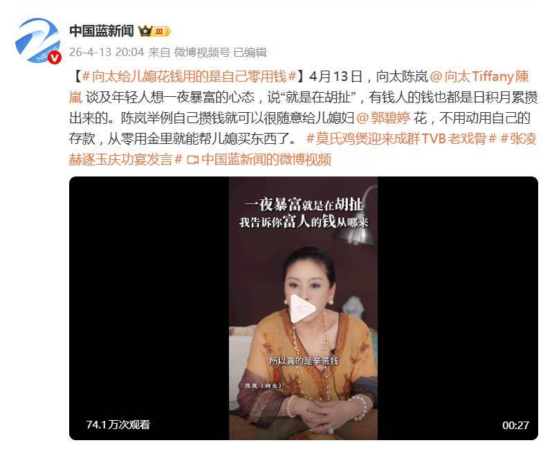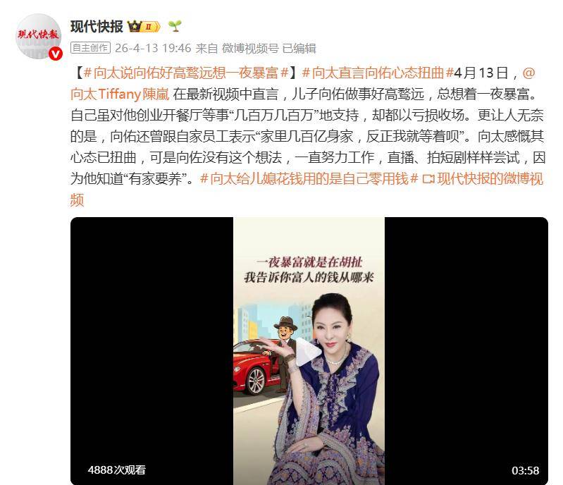 “一夜暴富?就是在胡扯!”据4月13日晚间报道,向太陈岚一句对年轻人财富观的犀利点评,直接冲上热搜。在她看来,即便是顶级富豪的财富,也绝非从天而降,而是“日积月累攒出来的”。