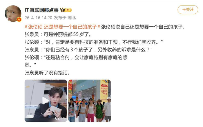 据网友4月16日爆料,43岁的张伦硕在综艺节目里的一番表态,直接让话题冲上了热搜。面对主持人张泉灵,他坦言仍希望与55岁的妻子钟丽缇生育一个属于两人的孩子,并提出了“科技干预”和“收养”两套方案,理由直指“孩子是家庭粘合剂”。