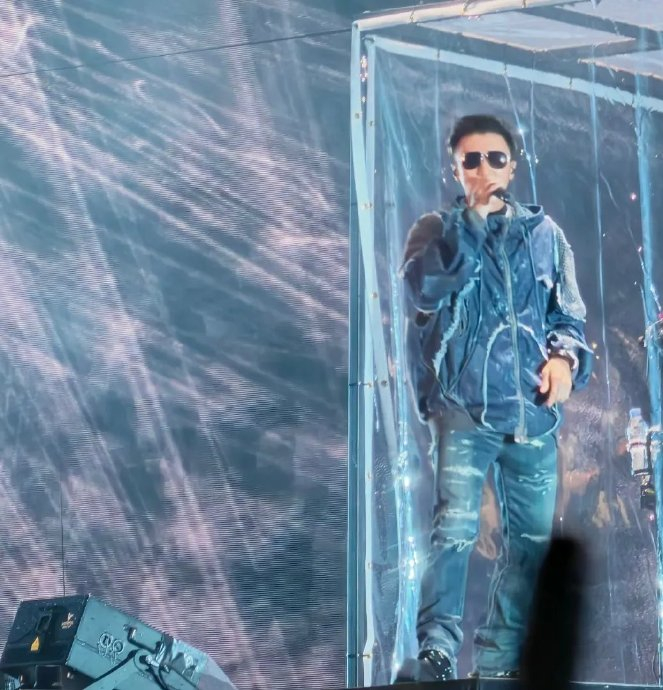 暴雨中无人退场,观众席亮起由透明雨衣和荧光棒组成的蓝色星海。当《因为爱所以爱》前奏响起,三万人的合唱声浪轰然爆发,穿透雨幕直冲云霄。场外未能入场的粉丝自发加入,沌口地铁站周边形成立体环绕声场。
