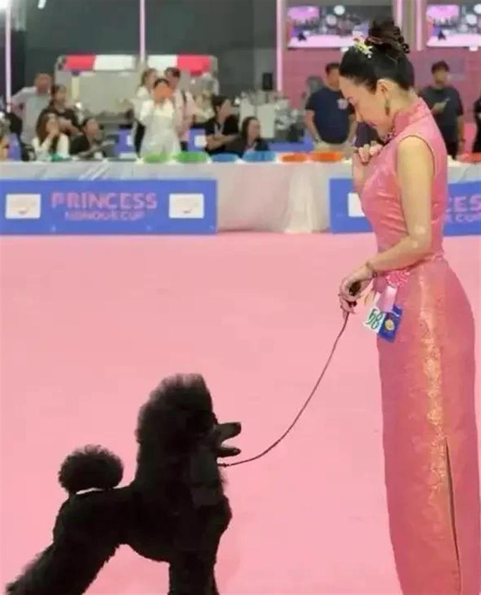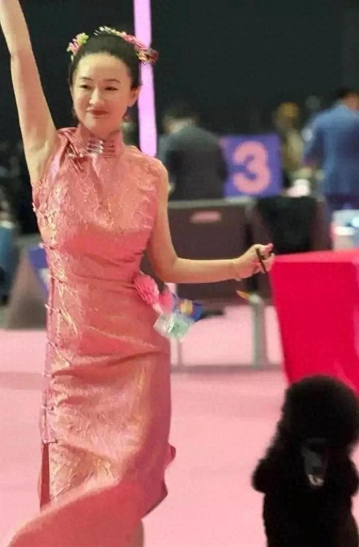 霍思燕是带着她11个月大的中型贵宾犬“霍蜜蜡”来参加比赛的。 比赛现场,她穿着一身粉色改良旗袍,头发全部盘在脑后,脚踩平底鞋,几乎是素颜状态。 镜头拉近时,能清楚看到她眼角的细纹和脸颊泛红的状态。