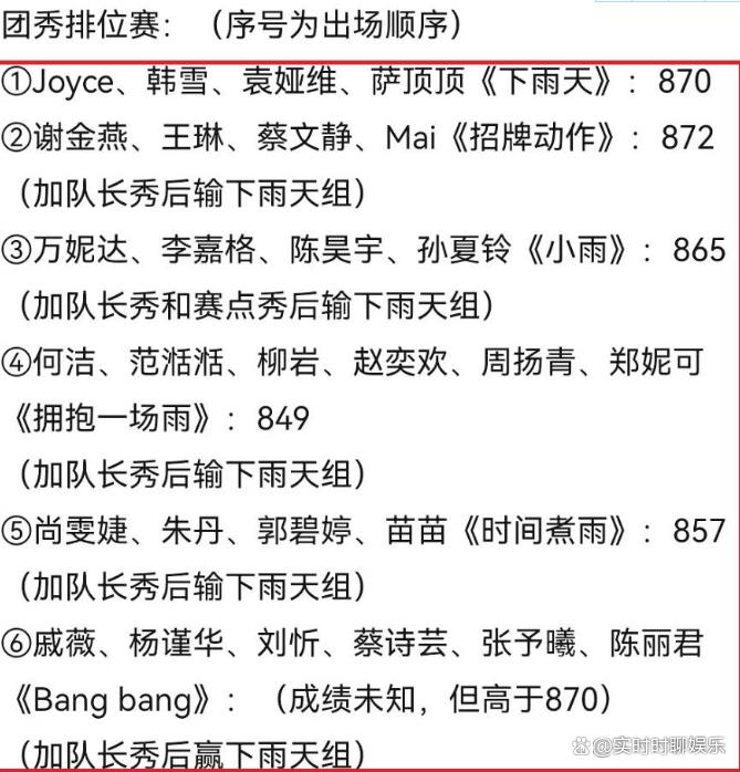 最为引人注目的当属第六组,戚薇、刘忻、陈丽君、杨谨华、蔡诗芸以及张予曦共同演绎了热门英文歌曲《bang bang》。尽管现场并未公布该组的团秀分数,但据推测,其分数应高于《下雨天》的870分,再加上队长秀的得分,使之成功实现了攻擂。