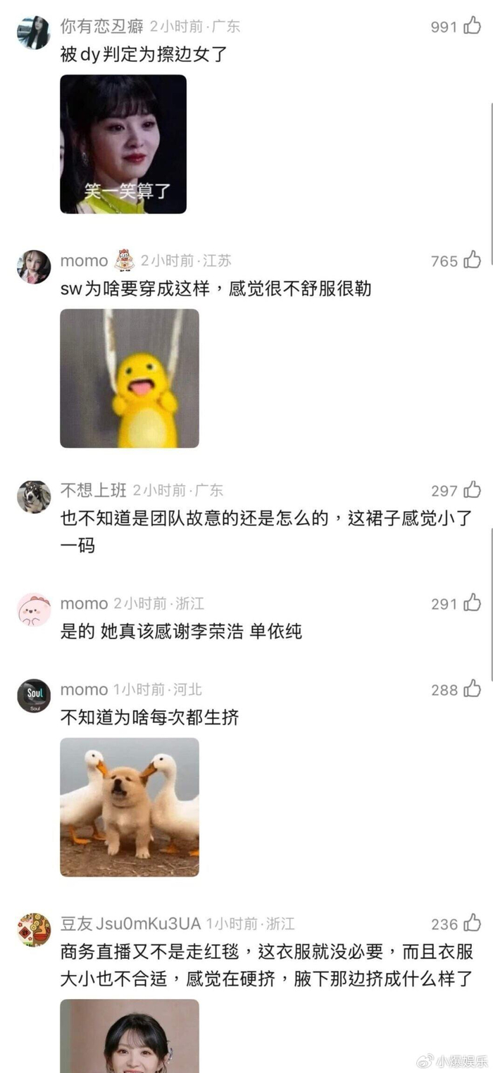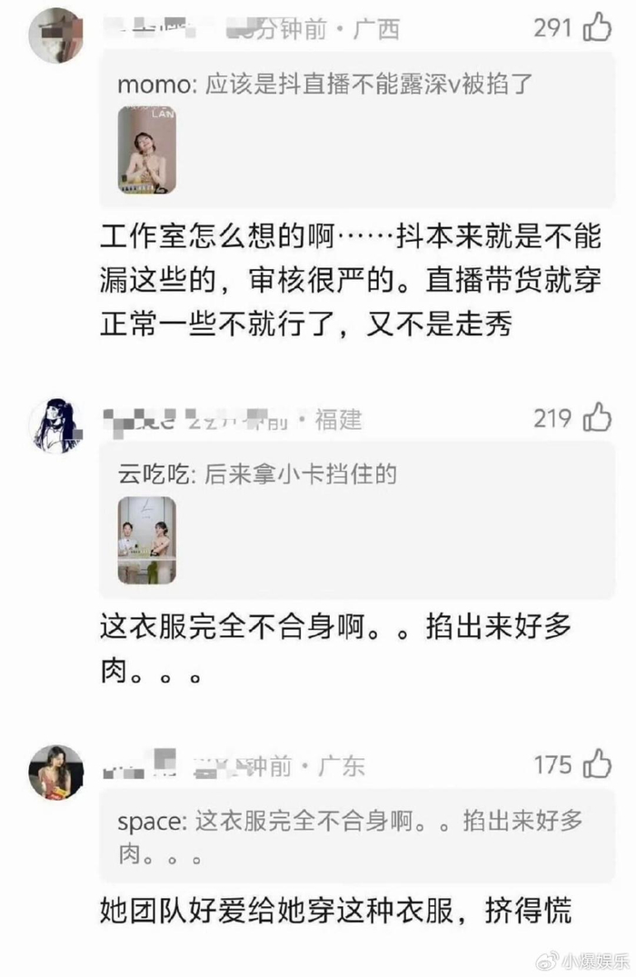 粉丝们早就去她经纪公司“浩瀚星缘”底下留言要求换团队,一直没人理。这次直播,裙子尺码严重偏小,把田曦薇腰背、胸部都勒出了明显的压痕,这已经不是美不美观的问题了,是让她身体难受,连活动和呼吸都受限制。一个护肤品直播,按理说调性应该是清新、舒适,结果给她套上这么一件紧身性感的裙子,跟她一直以来的“甜妹”形象也不搭啊,团队这工作做得,也太敷衍了。