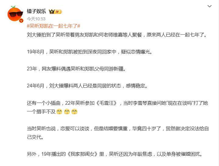 消息一出,网友们立刻化身“时间管理大师”,迅速梳理出两人长达数年的“低调恋爱时间线”。早在2019年8月,两人就被拍到深夜同回家中,恋情初露端倪。到了2023年,更有网友爆料偶遇吴昕与郑凯父母一同在新疆游玩,关系显然已进阶到见家长阶段。而知名爆料者刘大锤在2024年6月也曾指出,两人已处于稳定的同居状态。这一切线索串联起来,勾勒出一段持续多年、稳步发展的感情轨迹。