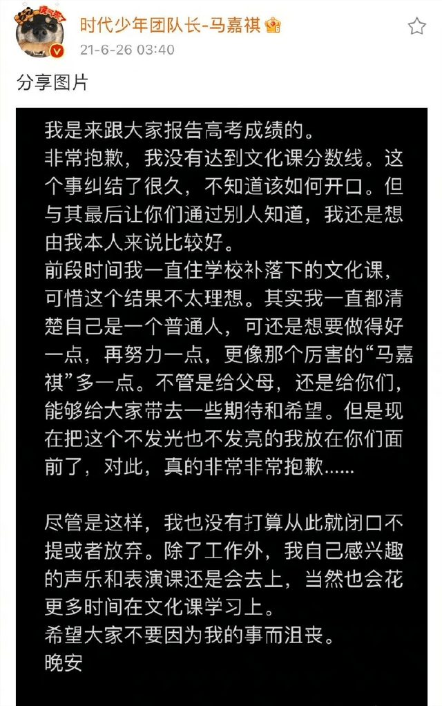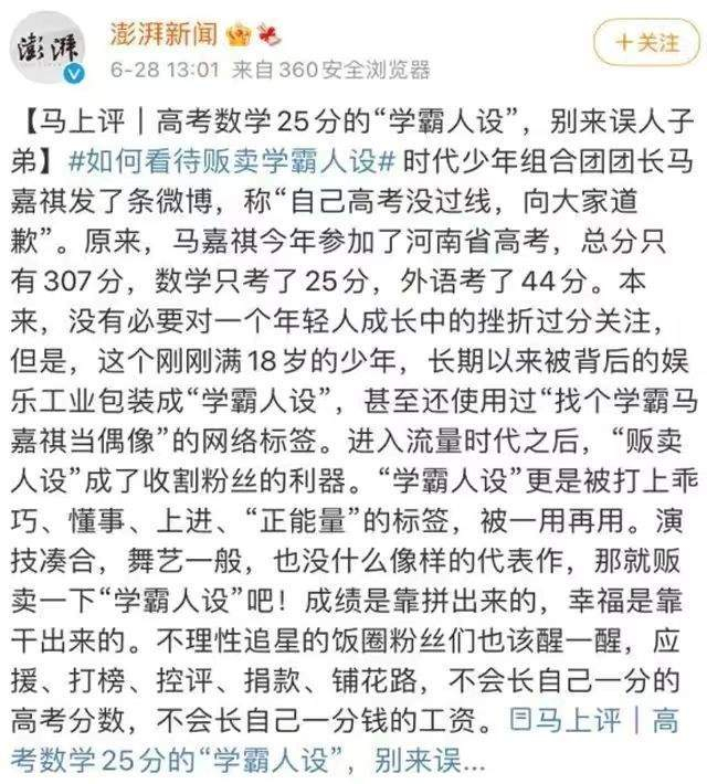 马嘉祺本人也发文道歉了,表示以后会花更多时间在文化课学习上。