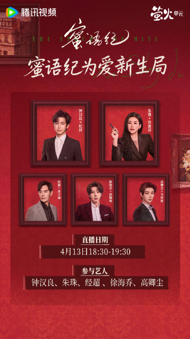 《蜜语纪》开播直播已于 2026 年 4 月 13 日晚火热落幕,钟汉良、朱珠等主演空降直播间与观众沉浸式互动,多场活动覆盖微博、腾讯视频及爱奇艺平台。