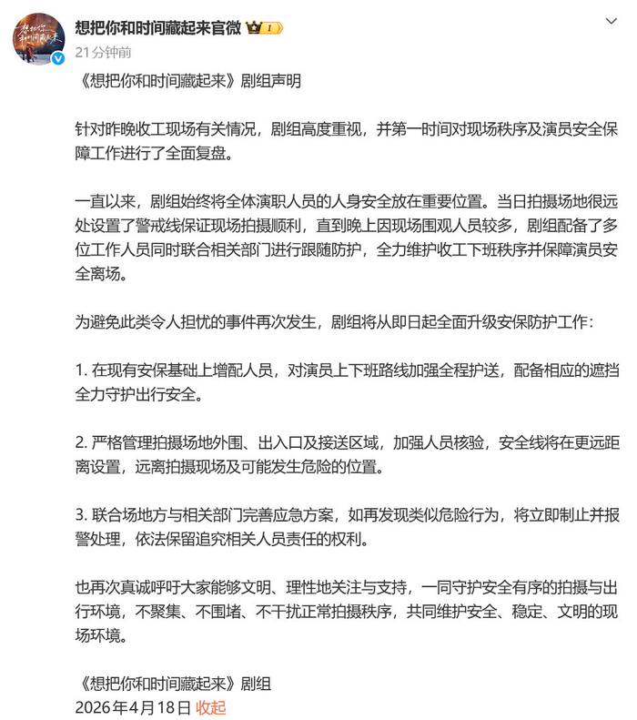 【#王安宇新剧剧组全面升级安保#】#剧组回应王安宇疑被激光笔照射#近日,王安宇下班疑似被激光笔照射,引发热议。18日,@想把你和时间藏起来官微 回应称,当日拍摄场地很远处设置了警戒线保证现场拍摄顺利,直到晚上因现场围观人员较多,剧组配备了多位工作人员同时联合相关部门进行跟随防护,全力维护收工下班秩序并保障演员安全离场。为避免此类令人担忧的事件再次发生,剧组将从即日起全面升级安保防护工作。