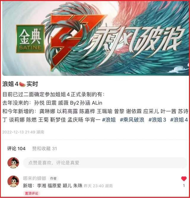 在刚结束不久的湖南卫视和芒果的双平台招商会上,《浪姐4》首度亮相,节目全称是《乘风破浪·大美中国季》。