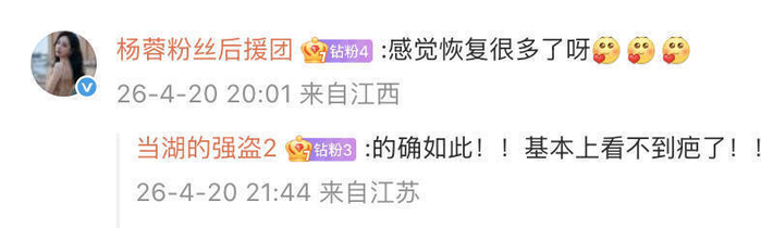 4月21日,她再次更新近照,可以看到疤痕已大幅淡化,几乎看不出来,状态特别好。