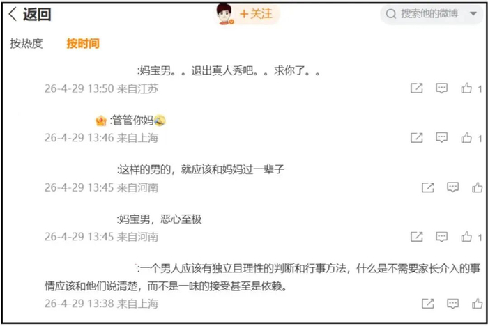 之前孙杨社媒评论区都是吐槽他对妻子张豆豆的态度,如今孙杨社媒评论区变成了吐槽他妈宝——有人求他退出真人秀,有人让他管管自己妈,还有人直接开骂。