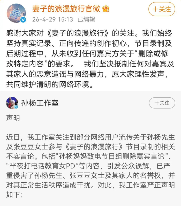 节目组转发了孙杨工作室声明,帮孙杨妈妈辟了谣,强调节目坚持真实记录。