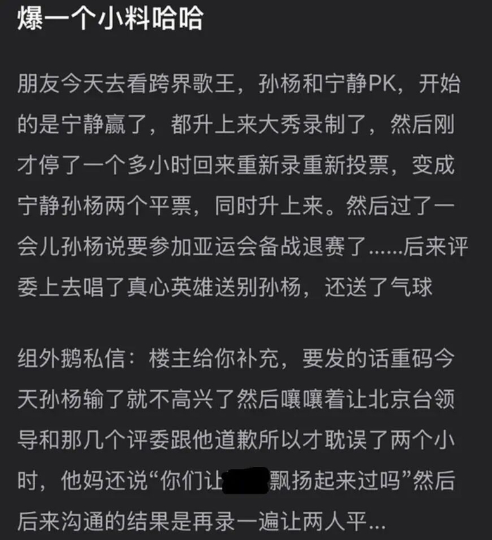 有网友爆料,孙杨和宁静一起录制《跨界歌王》,明明宁静赢了,现场却要重新录制重新投票,变成了孙杨和宁静同票,就因为孙杨输了不开心了,孙杨妈妈就大闹要求重赛。