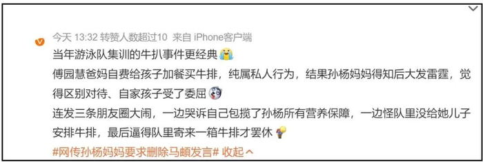 就因为傅园慧父母给女儿自费买了牛排,孙杨妈妈得知后,就发了千字长文大闹,指责游泳队区别对待。