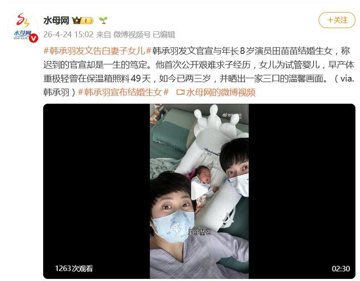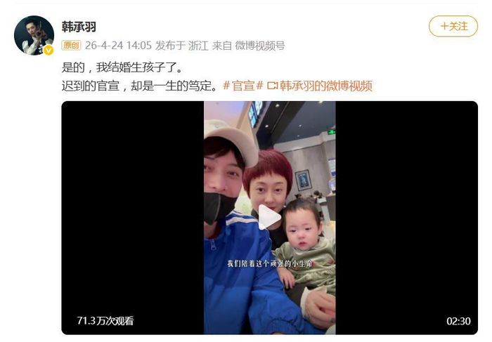 4月24日,演员韩承羽在个人社交平台突然甩出一段视频,正式官宣自己结婚生女的消息,瞬间冲上热搜。他在配文里写了一句:“迟到的官宣,却是一生的笃定。”这句轻描淡写的话背后,藏着的却是一段长达数年的艰辛求子路。