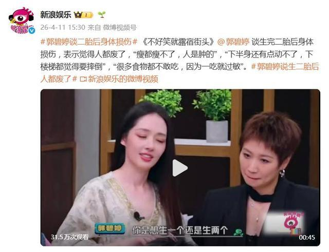 节目中,郭碧婷坦言,二胎给身体带来的损伤远超一胎。生第一胎时她还“感觉还好”,但到了第二胎,情况急转直下。最直观的问题就是身体长期浮肿,“瘦都瘦不了,人是肿的”,这种状态持续了数年,经过漫长调理才慢慢改善。
