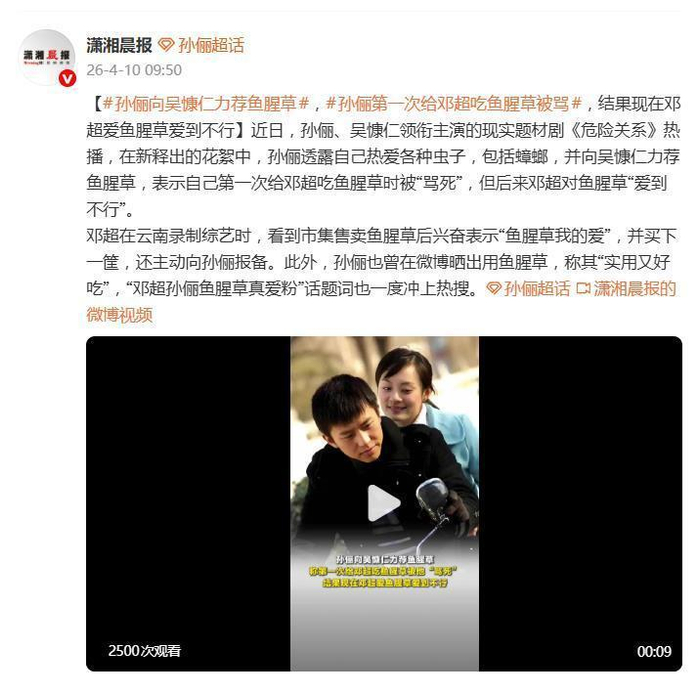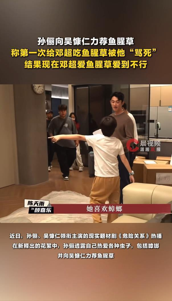 这还不算完,在宣传新剧的花絮中,孙俪与吴慷仁交流饮食喜好时,又化身 " 安利狂魔 ",热情推荐起了一种让无数人爱憎两极的食物——鱼腥草(又名折耳根)。她更是贡献了自家老公邓超的 " 真香 " 现场:第一次给邓超吃鱼腥草时,直接被 " 骂死 "。这画面感,光是想想就替超哥当时的瞳孔地震捏把汗。