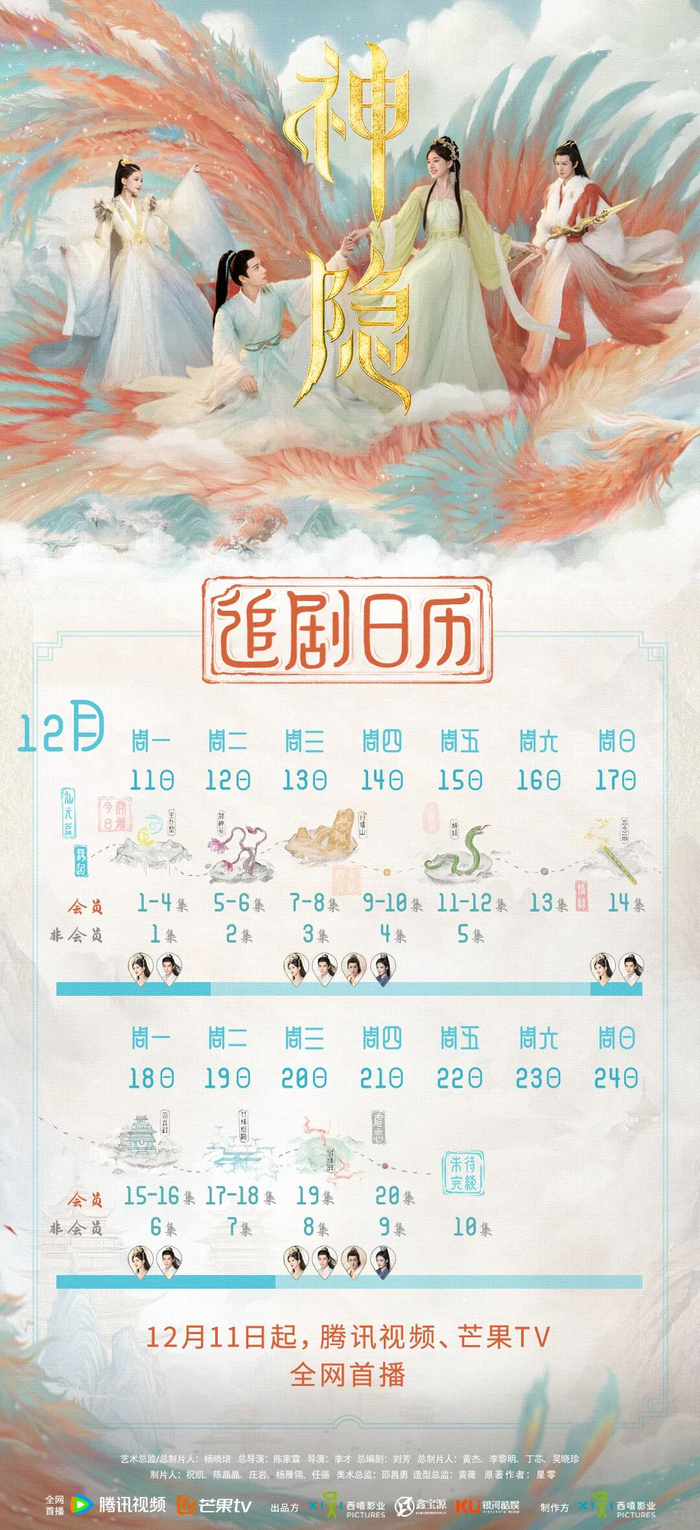 《神隐》今日起将在腾讯视频、芒果TV双平台开播,会员首播连更11天,12月25日起每周一到周四更新。全新的仙侠冒险之旅即将开启,一段带着荡气回肠的传奇故事,唯美浪漫的视听盛宴在今晚燃情来袭!