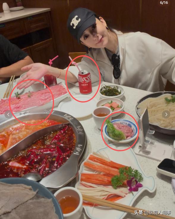一组是方媛和工作人员聚餐,桌上摆着鸳鸯锅,辣锅与番茄锅分明,猪脑、毛肚、鸭肠一应俱全。