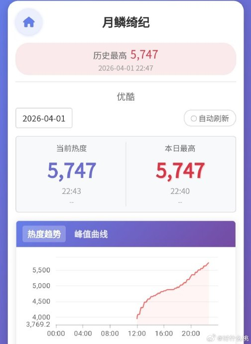 4月1日,《月鳞绮纪》突袭定档优酷独播。尽管遭遇主演鞠婧祎税务争议(丝芭传媒举报后被税务部门澄清无问题),但预约量仍突破260万,首日灯塔播放量达2747万,登顶年度独播剧榜首。开播1小时站内热度突破4404,次日午间破7000,创优酷年度首日热度增速纪录。