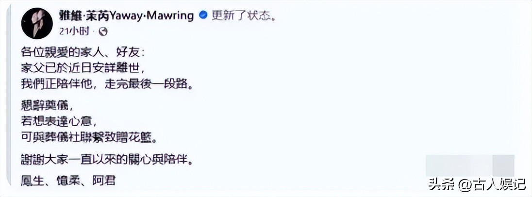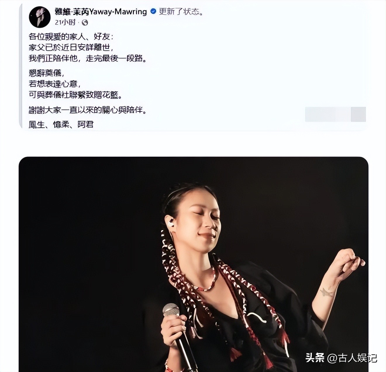 金曲奖原住民歌手雅维·茉芮在个人社交账号上公开了父亲离世的消息,这位77岁的老人,正是S妈的亲哥哥。