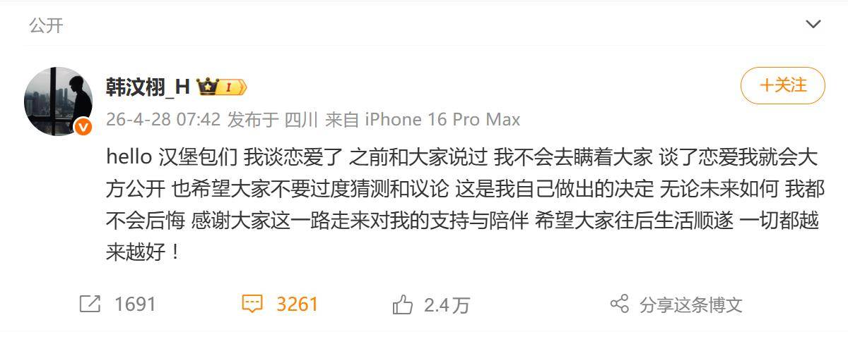 在这个全民吃瓜的时代,能有一个网红大大方方站出来说“我恋爱了,不后悔”,本身就挺难得的。至于那位神秘的“汉堡包老板娘”到底是谁,或许时间会给出答案。但至少今天,韩汶栩用自己的方式证明了一件事:真诚,永远是最好的人设。