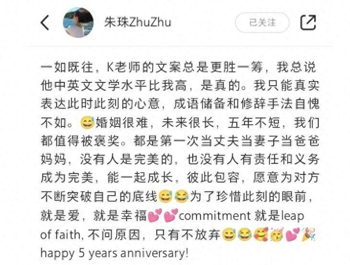就在前几天,演员朱珠冷不丁在社交媒体上甩出一波家庭合照,配了一大段走心文字。 原来,是她和老公王昀佳结婚五周年的纪念日。