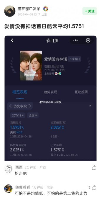 《爱情没有神话》的扑街并非单一因素所致。它暴露出制作方三重困境:过度依赖明星效应忽视内容深耕,危机公关失当加剧舆论反噬,以及对女性题材受众的认知错位。若后续无法通过职场线深化或女性互助剧情挽回口碑,此案或将成行业警示:编剧个人品牌管理、剧集宣发精准度、主演市场适配性,缺一不可。