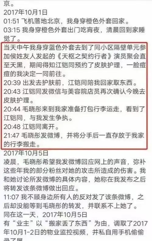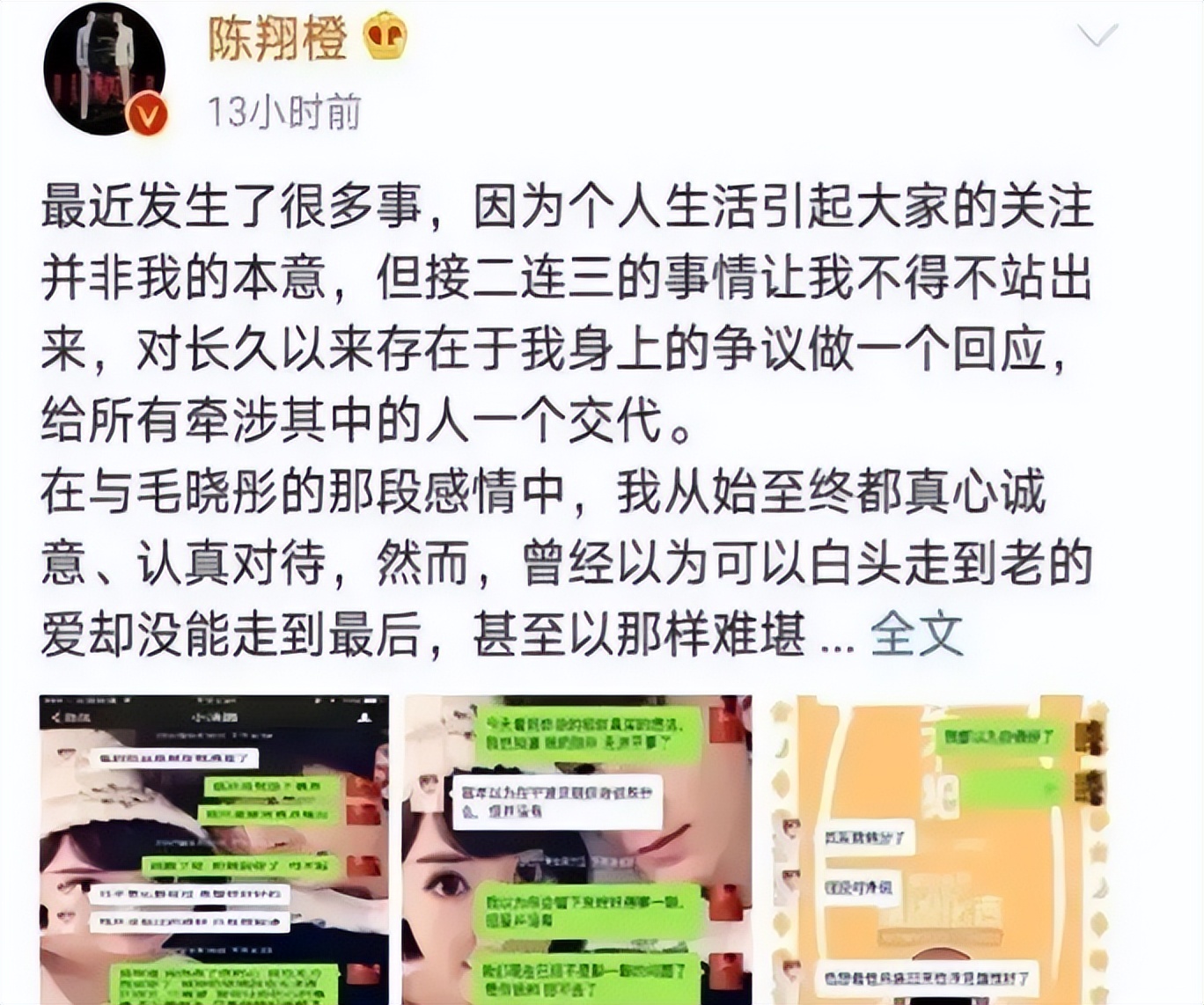 长文里,他晒出几张聊天截图,系统性地重新叙述了整件事的"真相":他说,自己跟毛晓彤早在当年9月就已经分手了,彼此都清楚这段关系结束了。