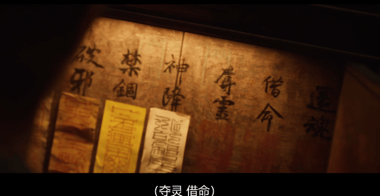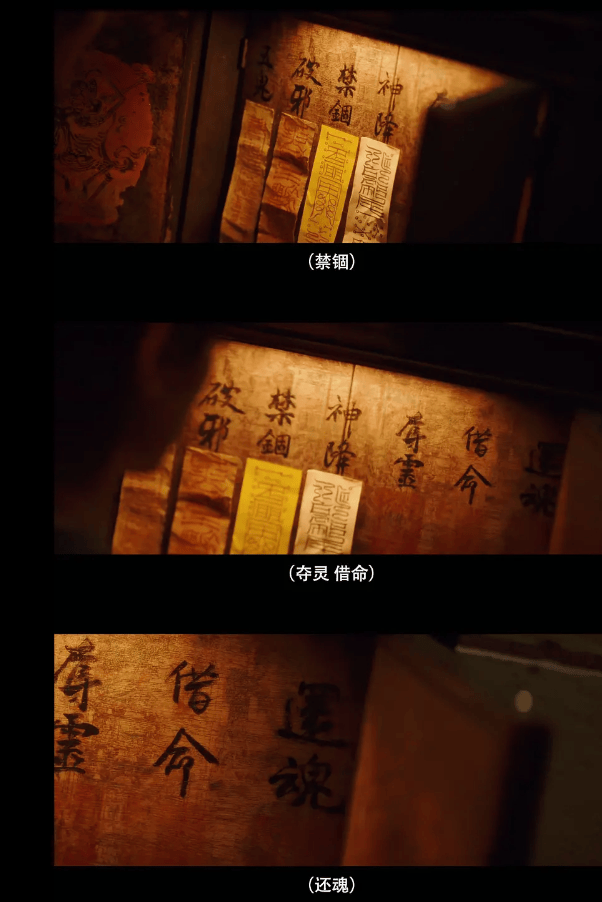 彩蛋中,驱魔师阿生打开柜子,禁锢、夺灵、借命等邪术的牌子上,都贴着神符封禁,唯独“夺灵”“借命”“还魂”没有贴符。