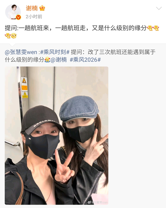 #张慧雯谢楠改三次航班还偶遇# 真的被这波缘分惊到!@张慧雯wen 改签三次仍偶遇@谢楠,来长沙和离开都同机,注定要见面的两位姐姐~#乘风2026#