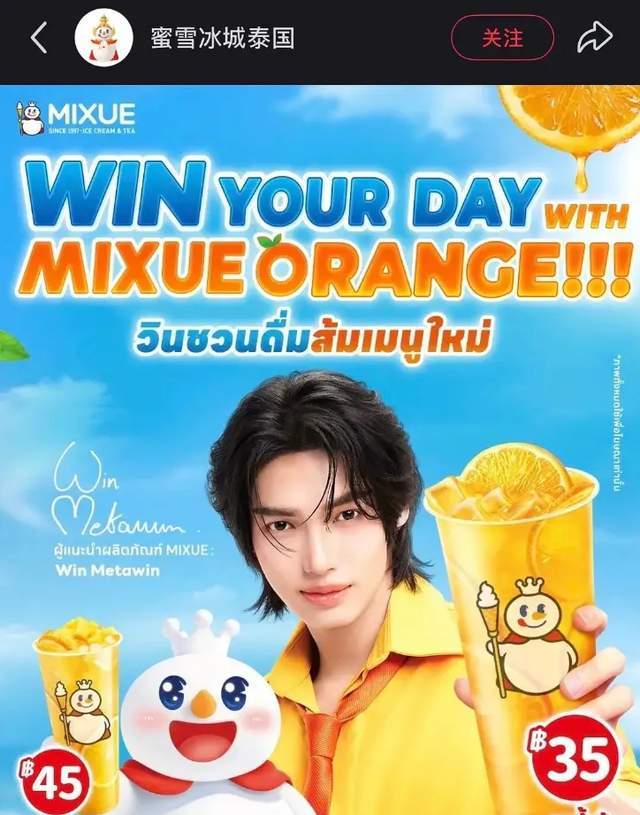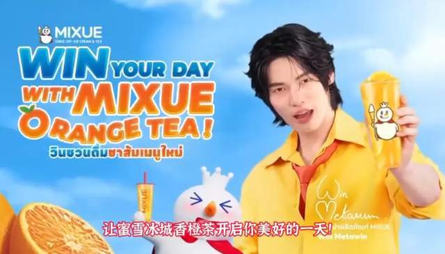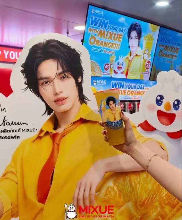 林汉洲出生于泰国曼谷,本人是中泰混血,一般被称为Win,有网友发现蜜雪冰城泰国门店铺设了大量Win的物料,还拍摄了广告,蜜雪冰城泰国账号也发布了官宣动态,妥妥的代言人待遇。